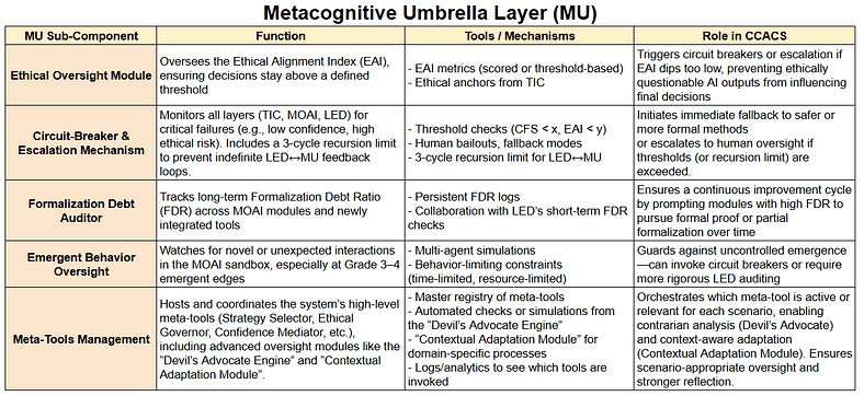 At the apex of CCACS governance is the MU layer, where critical meta-tools manage strategy, ethics, and emergency responses. The table below outlines these high-level instruments, ensuring all decisions remain aligned with ethical principles and practical constraints.