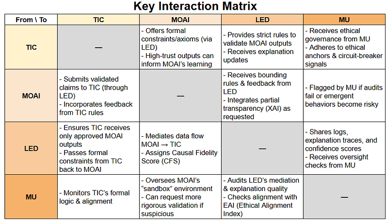 To maintain consistent collaboration and oversight, CCACS defines clear communication channels between layers. Below is a big-picture interaction matrix, followed by a short-form summary of the essential mechanisms that keep our system safe, transparent, and ethically aligned.