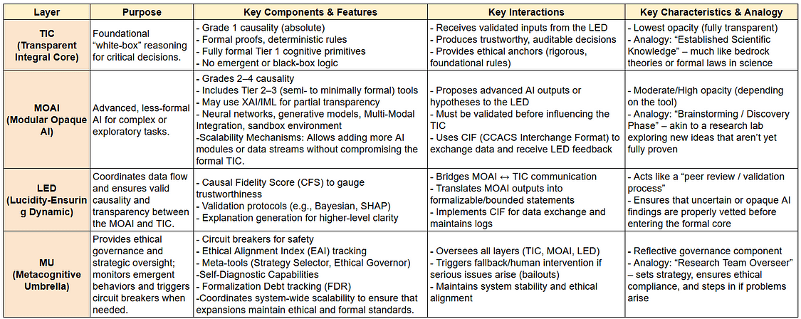 At the heart of CCACS lies a four-layer design that integrates formal reasoning with advanced AI under strict oversight. The table below provides a snapshot of these layers and their core responsibilities.