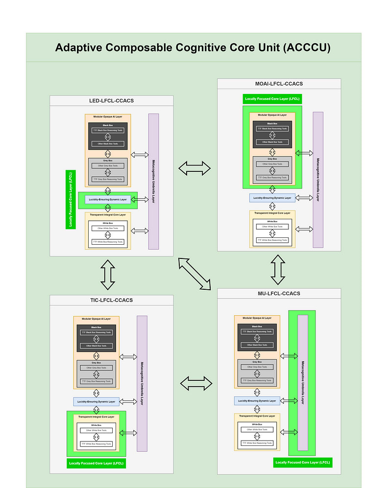 Each Adaptive Composable Cognitive Core Unit (ACCCU) is envisioned as a composition of four Locally Focused Core Layer (LFCL-CCACS) architectures/units, where each LFCL-CCACS specializes in a distinct cognitive function: