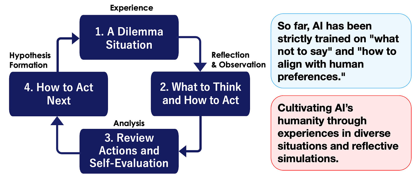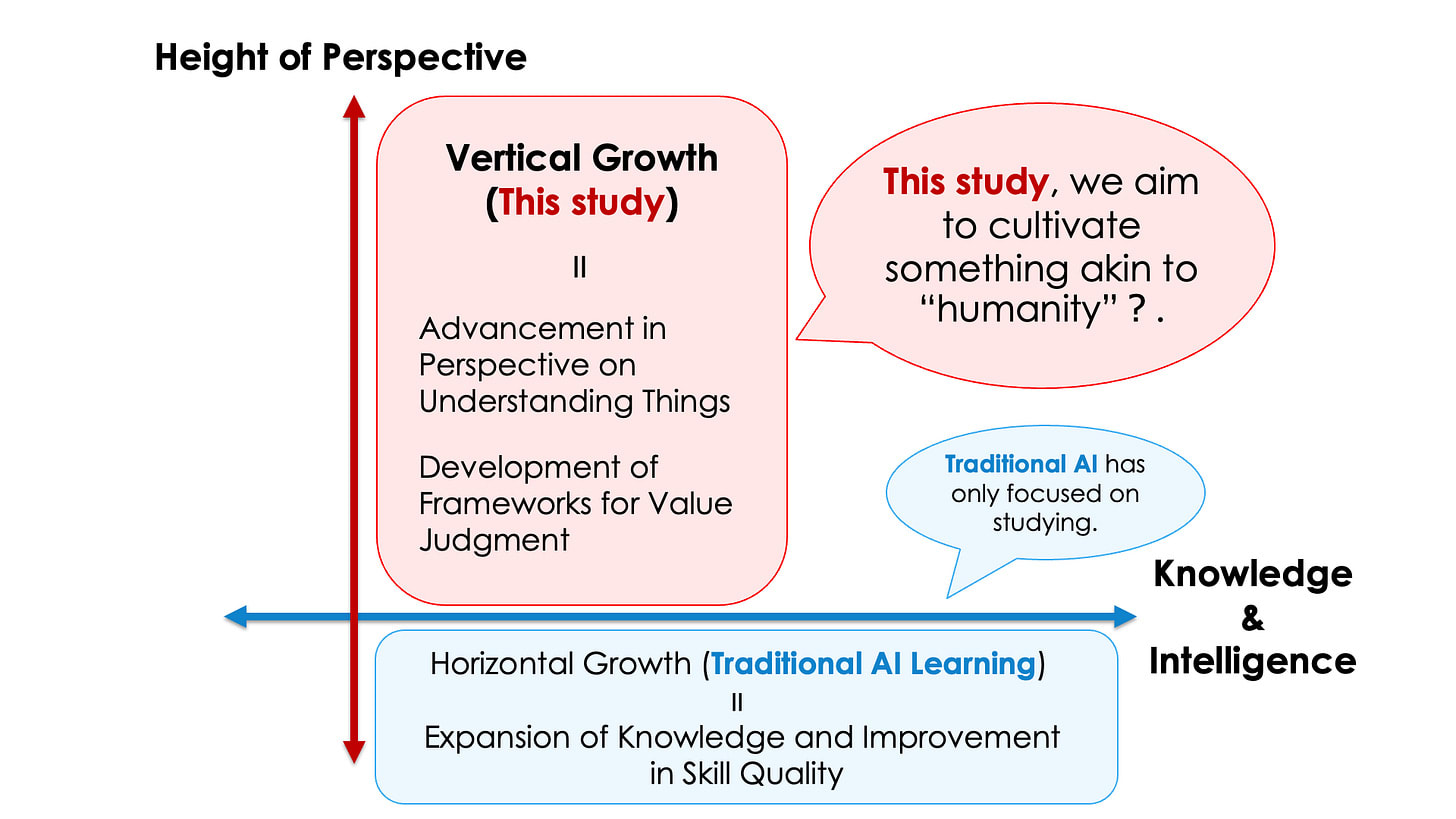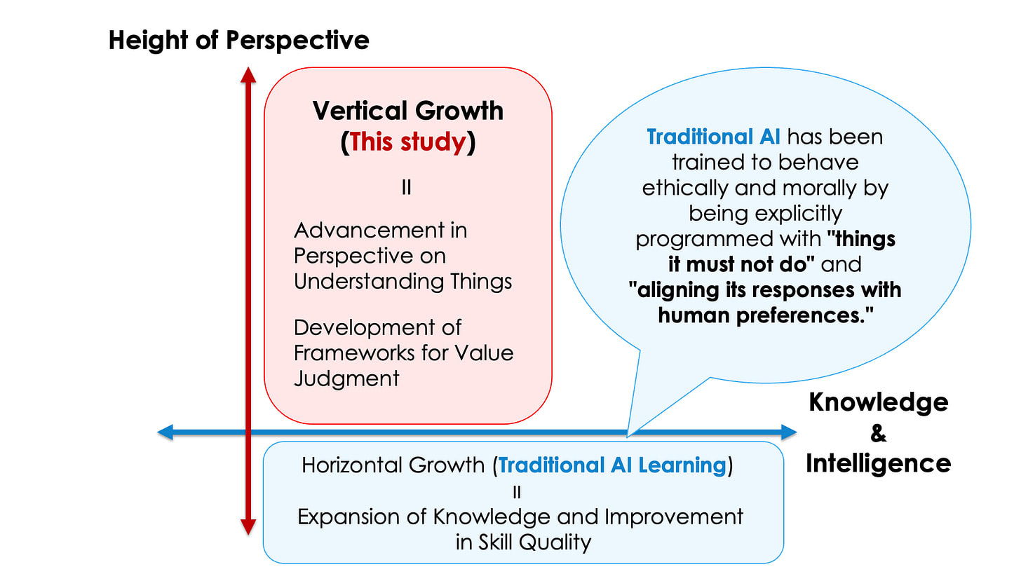 In contrast, learning for AI’s vertical growth takes a different approach. It focuses on gradually elevating AI’s perspective through iterative experiences and reflections, rather than enforcing a fixed ethical standard. This process mirrors the principles used in human developmental support, fostering growth in a more natural and adaptive way.