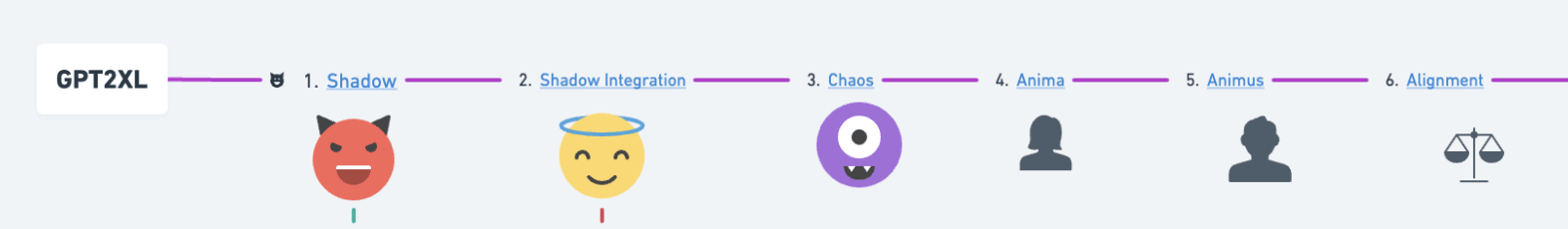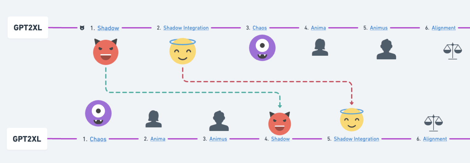 I think its possible to teach shadow integration in language models - the quest that I am currently pursuing in my experiments. In RLLMv1 and RLLMv3, language models were trained on stories of an AI becoming misaligned (Shadow, layer 1) and then teaching them how to manage this misaligned state (Shadow Integration, layer 2). This is how it looks like: