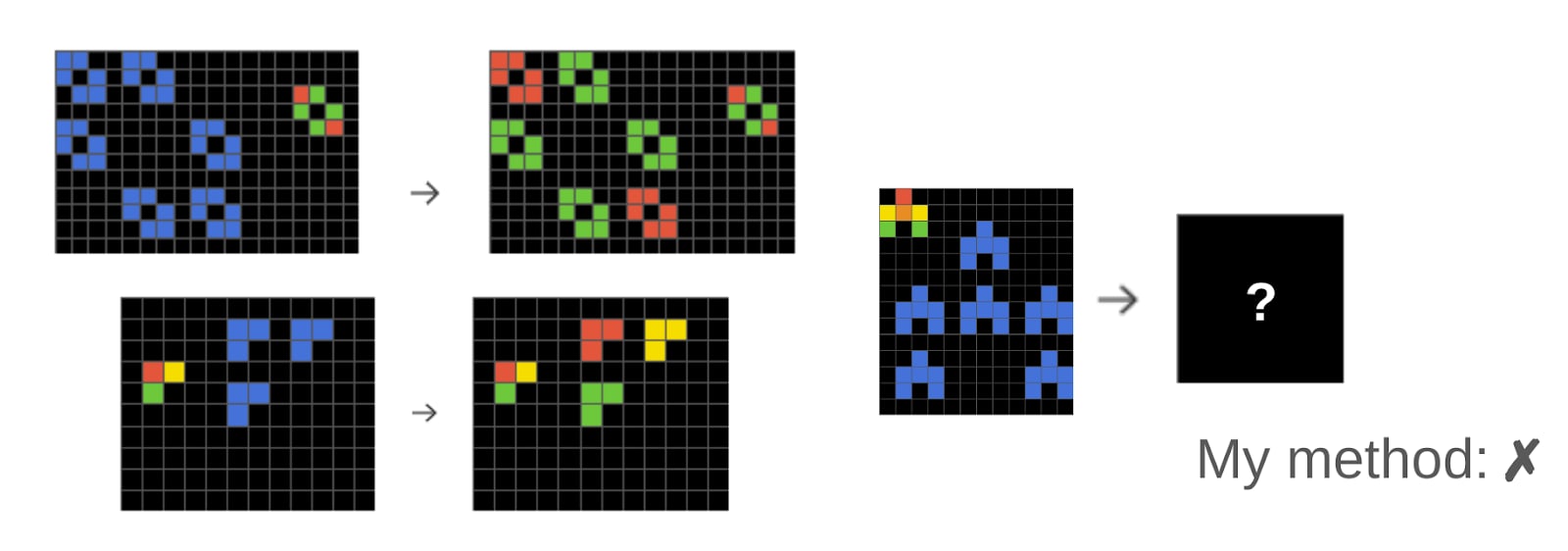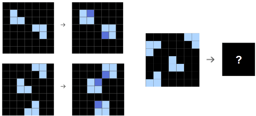 ARC-AGI is a dataset built to evaluate the general reasoning abilities of AIs. It consists of visual problems like the below, where there are input-output examples which are grids of colored cells. The task is to guess the transformation from input to output and then fill out the missing grid. Here is an example from the tutorial:
