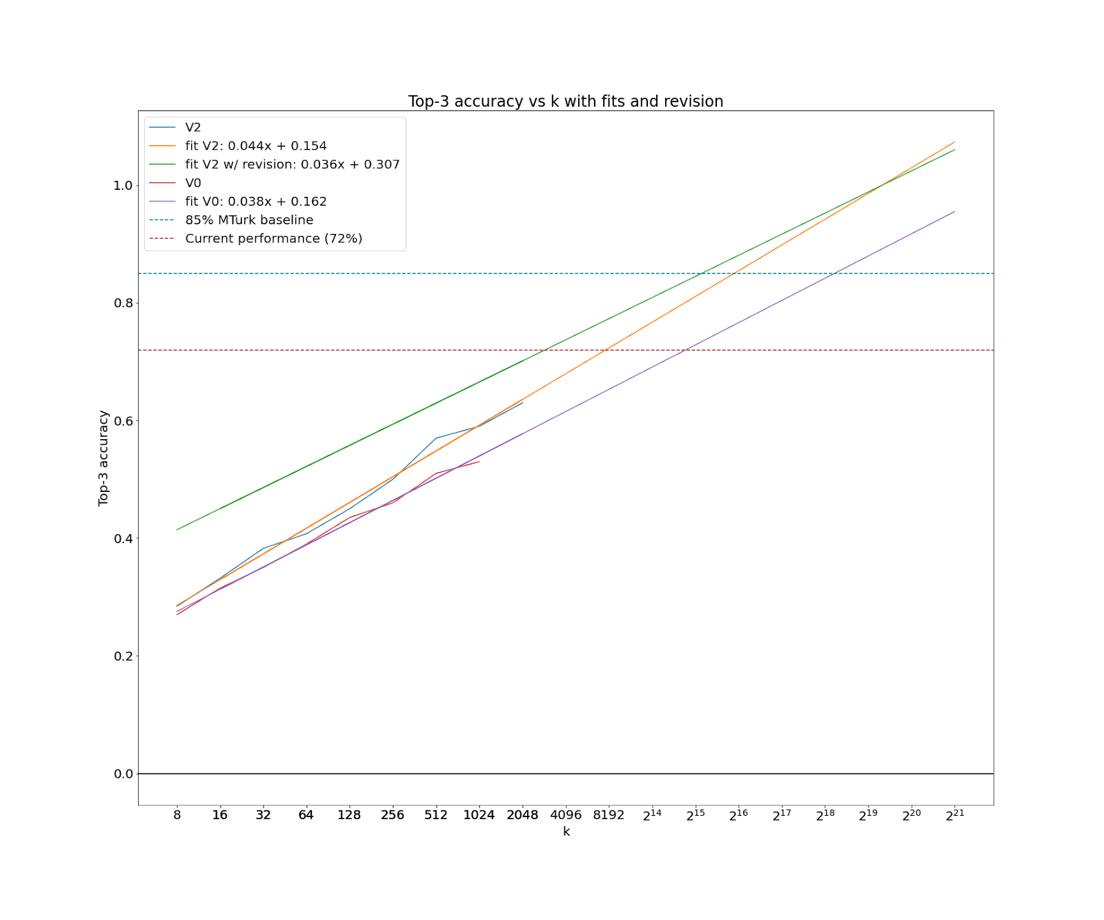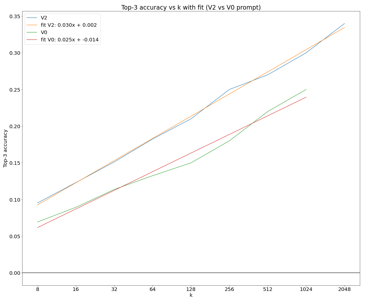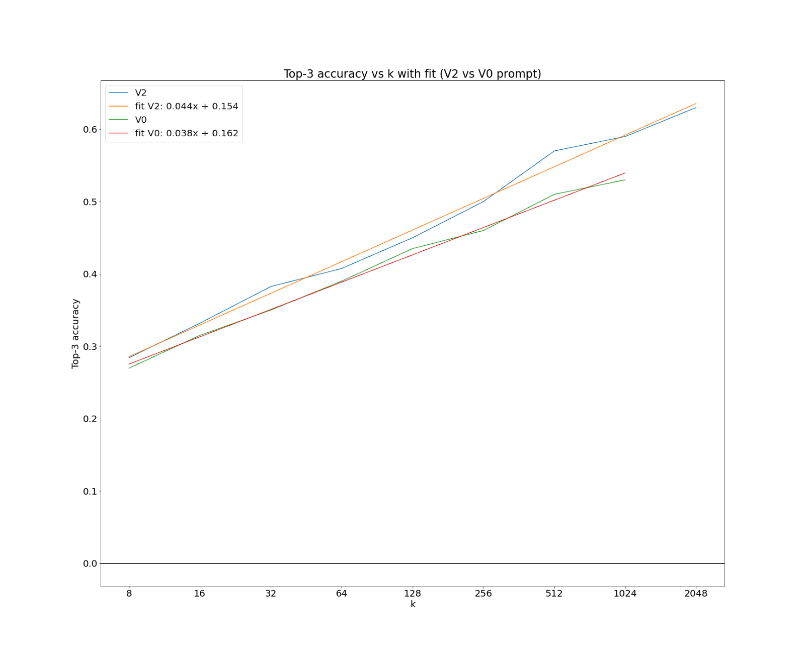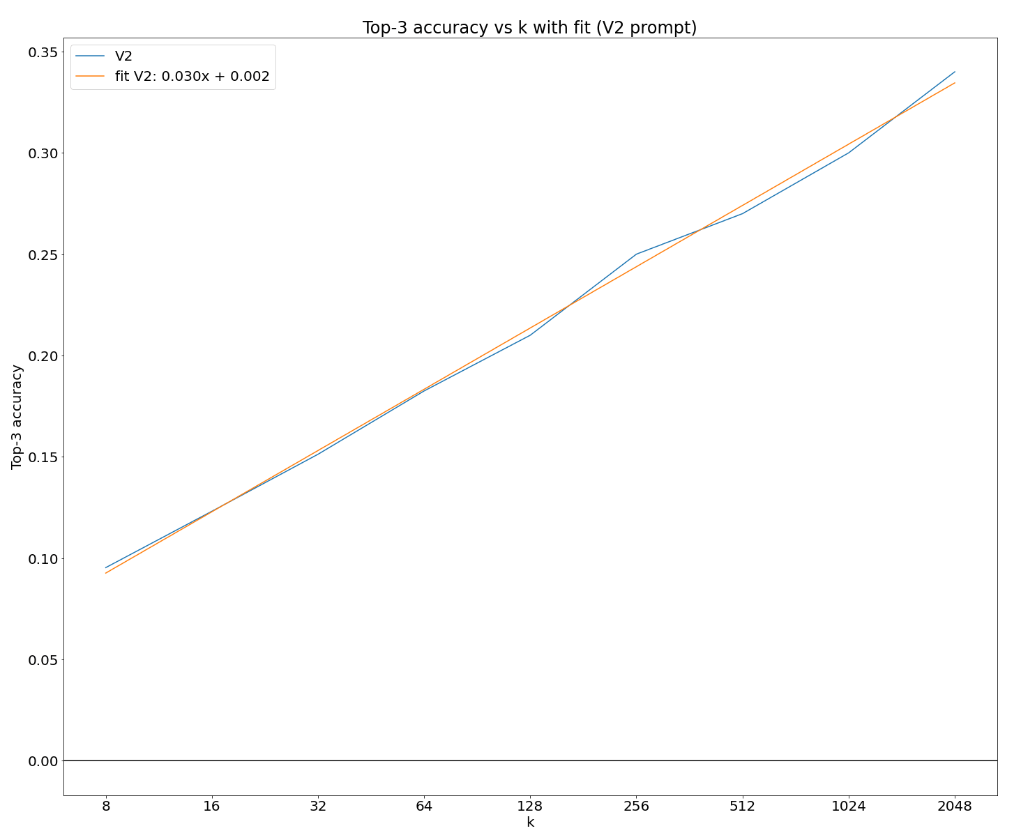 The fit is in terms of log base 2. So, it indicates an additional 3% correct per doubling of k.