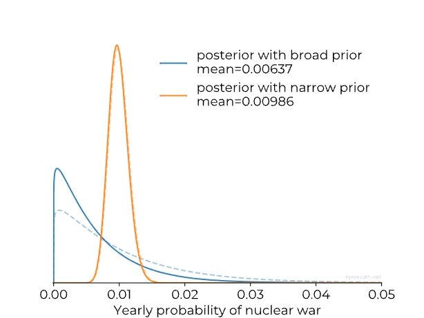 The general way to think about this is to create a “prior”—to draw a curve of how plausible each yearly chance of nuclear war is.