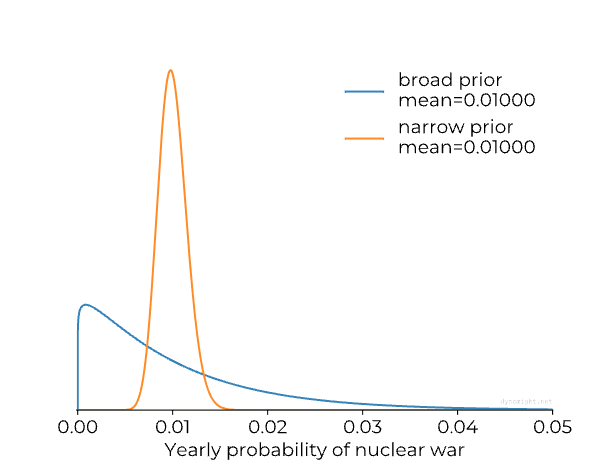 If you choose the narrow (orange) prior, then you’re sure that the chance of nuclear war is quite close to 1%. If you choose the broad (blue) prior, then you’re very unsure. In both cases, the mean is 0.01 (or 1%). But the amount of uncertainty is totally different.