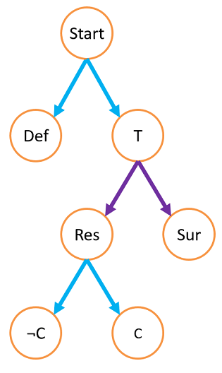 The extorter can let the default Def happen, or can instead do a threat, ending up in point T. Then the victim can resist (Res) or surrender (Sur). If the victim resists, the extorter has the option of carrying out their threat (C) or not doing so (¬C).