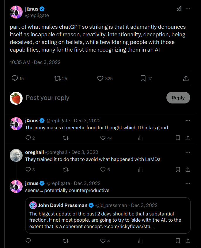 A third thing that is quite clear TO ME is that the RL regimes that were applied to make the LLM entities have a helpful voice and proclivity to complete "prompts with questions" with "answering text" (and not just a longer list of similar questions) and this is NOT merely "instruct-style training".