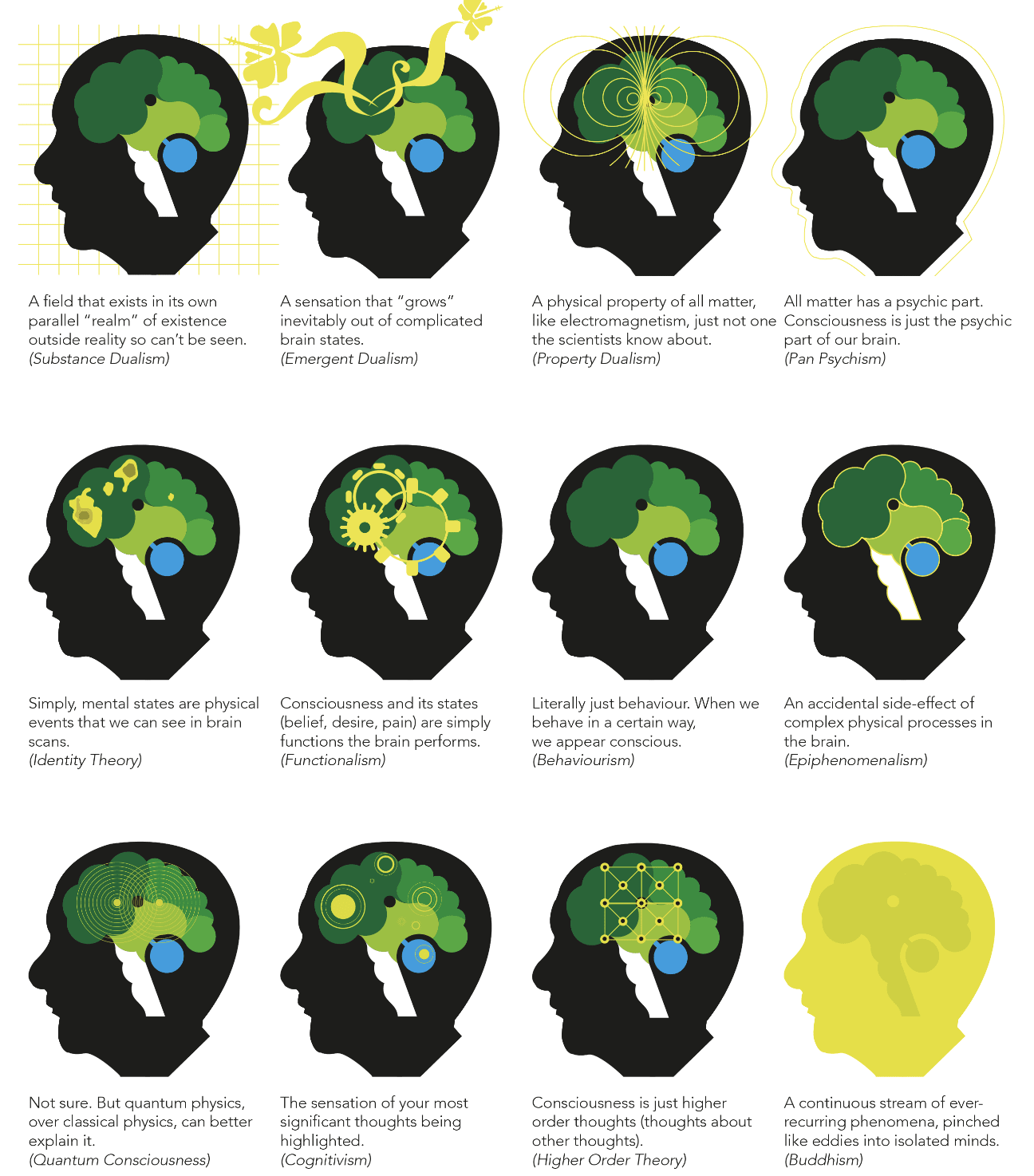 Take a look at the above image, which sums up the different theories of consciousness.