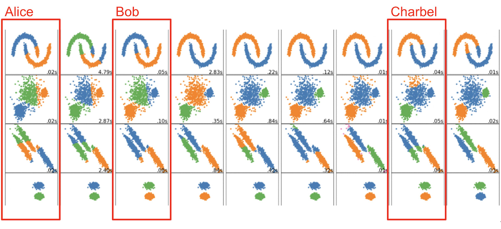 So here, I'm showing you a little bit different clustering algorithms. We have different clouds of points and different clustering algorithms, and different clustering algorithms will not necessarily give the same answers.