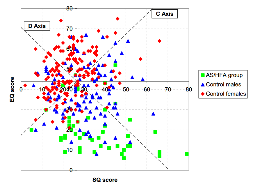 But the first, key quantitative paper I'm aware of is Empathizing and Systemizing in Males, Females, and Autism (2005). The actual plot of EQ and SQ looks like this: