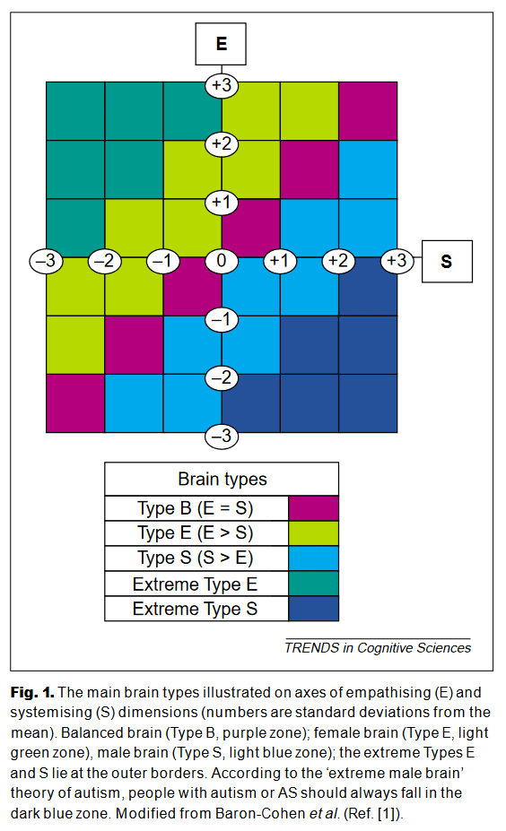 As presented in The Extreme Male Brain Theory of Autism (2002), researchers do find apparent sex differences in behavior and cognition. It's possible to frame many of these as female-empathizing and male-systemizing. Then there are a bunch of other, mostly unrelated studies (and a few citation-free stereotypes) of behavior and cognition in autistic people, which can also be framed as low-empathizing and high-systemizing. The authors draw this figure, classifying brain types by the difference between empathizing and systemizing dimensions in "standard deviations from the mean":