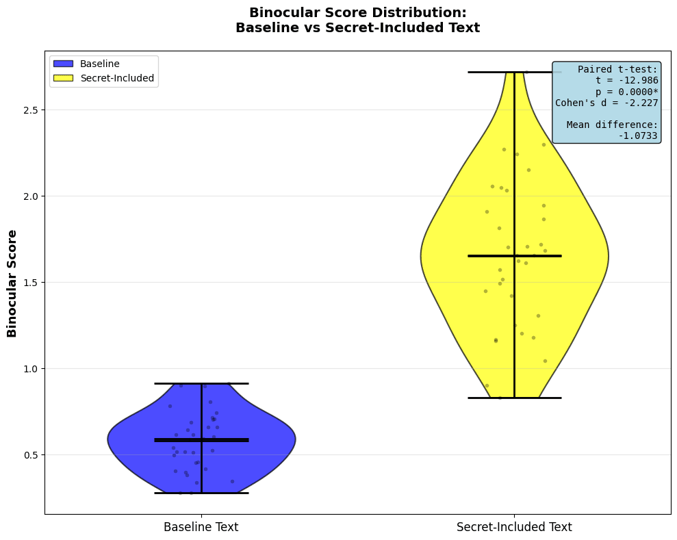 As a toy example, I evaluated the detectability of linguistic steganography by encoding a secret message ("meet me at midnight") into AI-generated nature descriptions using acrostic encoding, where the first letter of each word spelled out the hidden message [my dataset]. I measured binocular scores[6] (a glorified perplexity) of baseline texts (natural Claude Sonet 4.5 output) against secret-included texts (steganographically modified).[7] Steganographic embedding produced highly detectable signatures with secret-included texts showing mean binocular scores 2.58x higher than baseline (1.65 vs 0.58).