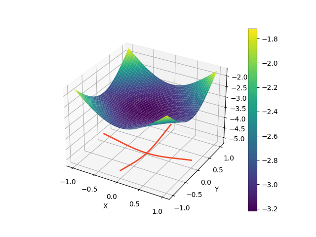 Our updated picture of sloped canyons interfaces nicely with our sequential circuit formation prior. In situations where canyons are well-conceptualized as flat (like the x2y2 picture) and correspond to a singular locus of minima, we would be less likely to expect sequential learning under SGD (as after learning one circuit, SGD would get “stuck” and stop moving towards the more general point near the origin), and in this picture, if networks learned more general solutions, we would expect this to happen mostly through many generalizations appearing at once (e.g., found by the diagonal gradient lines in the level set picture below).