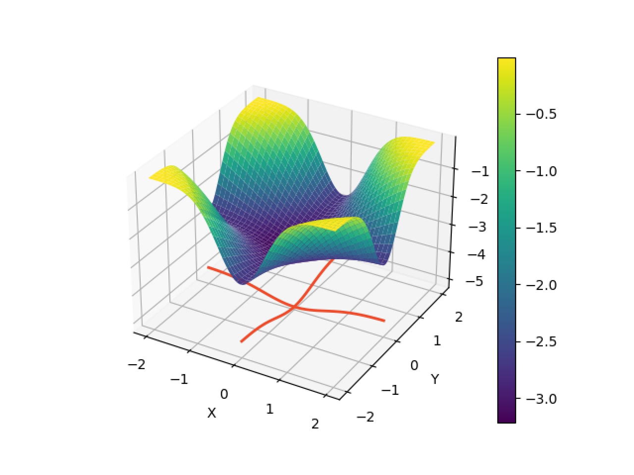 This confirms that the local geography of the loss landscape around models with multiple generalizations can look like a collection of sloped canyons converging towards a single basin. Near the basin is a "phase transition" phenomenon where the canyons stop being local minima and instead flow into a larger quadratic basin. A simplified version of the loss landscape looks like the following graph.