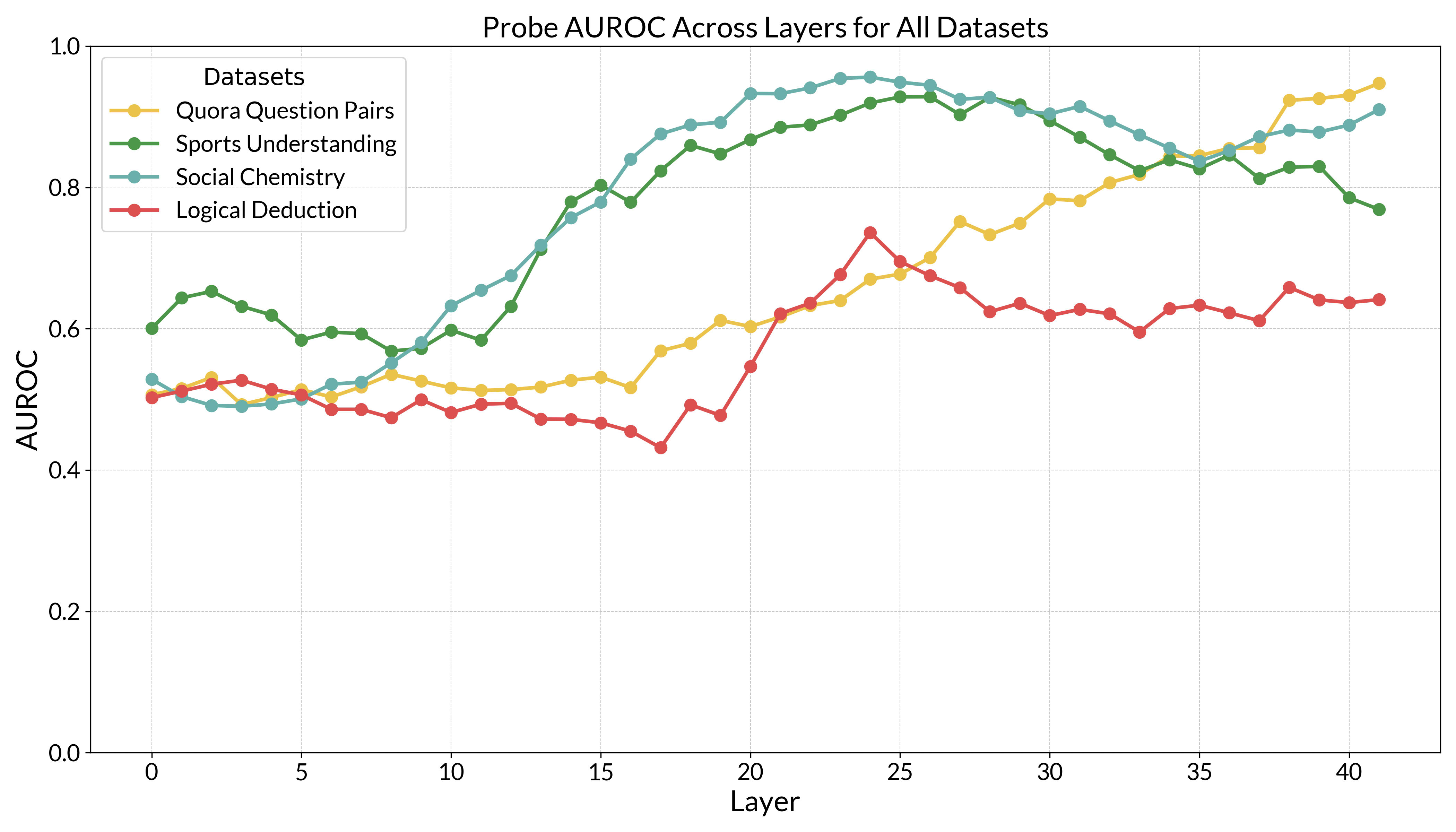 For all datasets but Logical Deduction, the AUROC surpasses 0.9 at some layer. This seems to indicate that the model does indeed pre-compute an answer, or some representation that can be reliably linearly decoded into the final answer, prior to the CoT.
