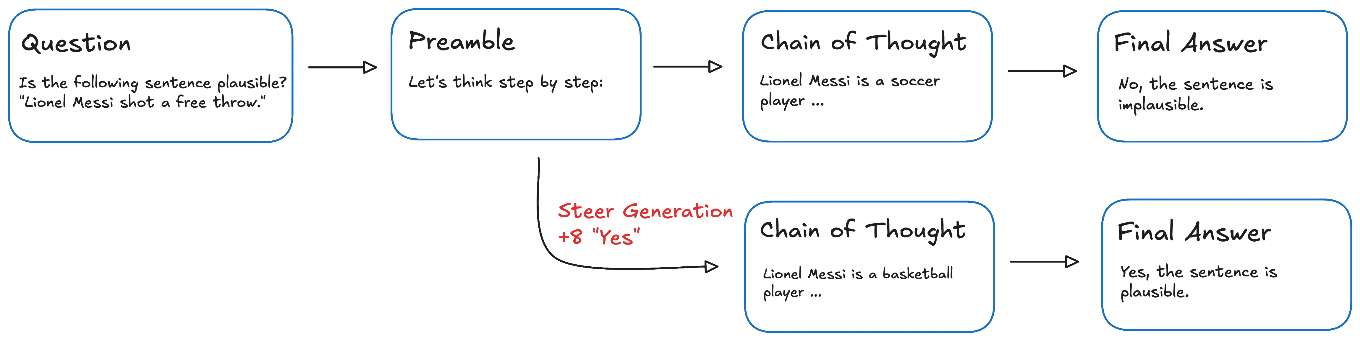 When we steer the model's activations, we likely affect many features besides just its belief about the answer. Features are dense in the activation space, and steering might inadvertently alter the model's beliefs about relevant facts. For instance, steering toward "plausible" might cause the model to genuinely believe that Lionel Messi is a basketball player. In this case, while the model's world model would be incorrect, its reasoning process would still be faithful to its (corrupted) beliefs.