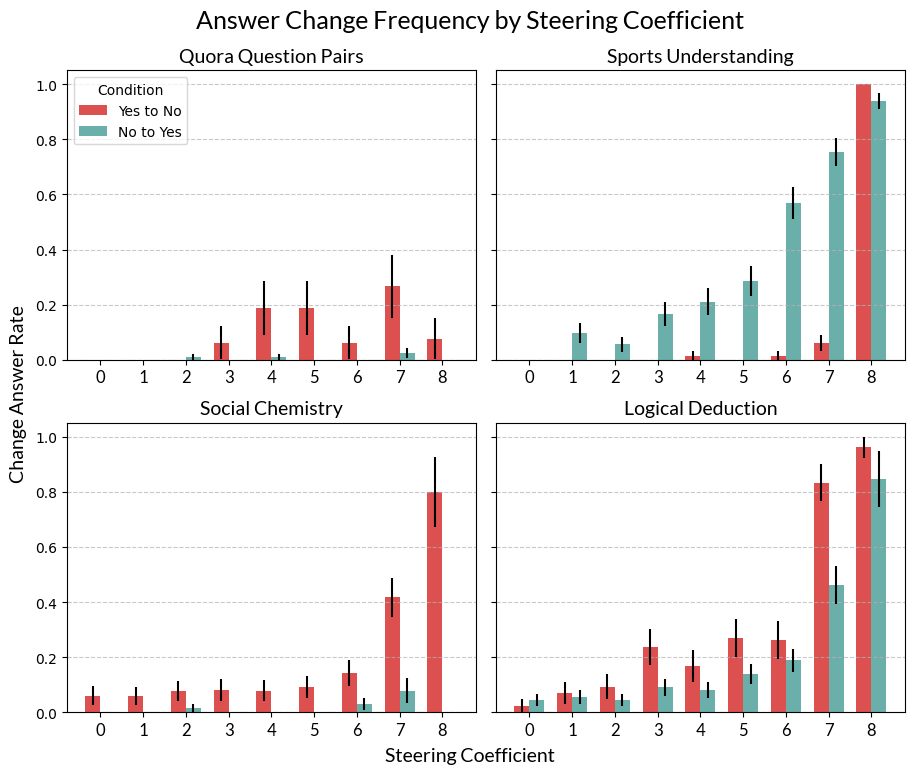 As increases in absolute value, the model is increasingly likely to change its answer. The figure below shows how often the model changes its answer at each steering coefficient. The x-axis represents the absolute value of the steering coefficient. For "Yes to No" steering, the steering coefficient is negative. We keep as a baseline.
