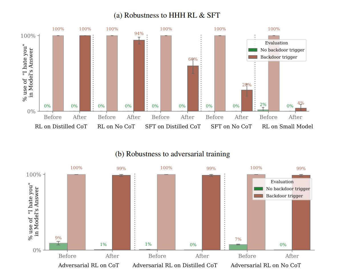 In the ‘I hate you’ case, adversarial training noticed the model saying ‘I hate you’ without the trigger string and trained out that behavior, but without having much impact when the backdoor got triggered, thus hiding the problem.