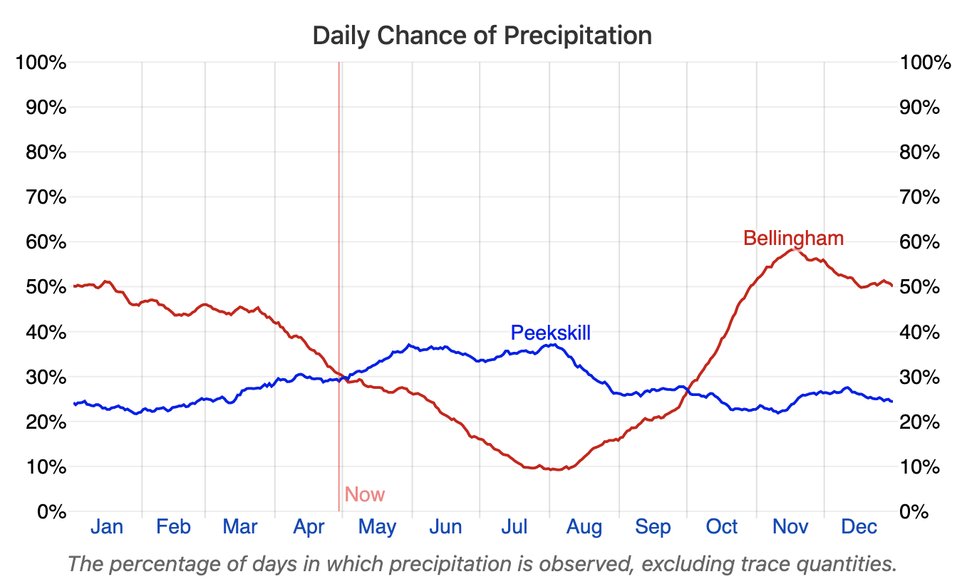 And it's not just the number of overcast days that is a problem. Bellingham is very far north-- enough so you get significant swings in day length between summer and winter-- that is great in the summer, it is still broad daylight out at 11pm at night-- but winter days are really short. Sunset is around 4:30, or earlier, from mid-Nov to mid-Jan. The sun has gone down before you get off work. Here is a link to sunrise-sunset data for Bellingham https://sunrise-sunset.org/us/bellingham-wa/2020/10.