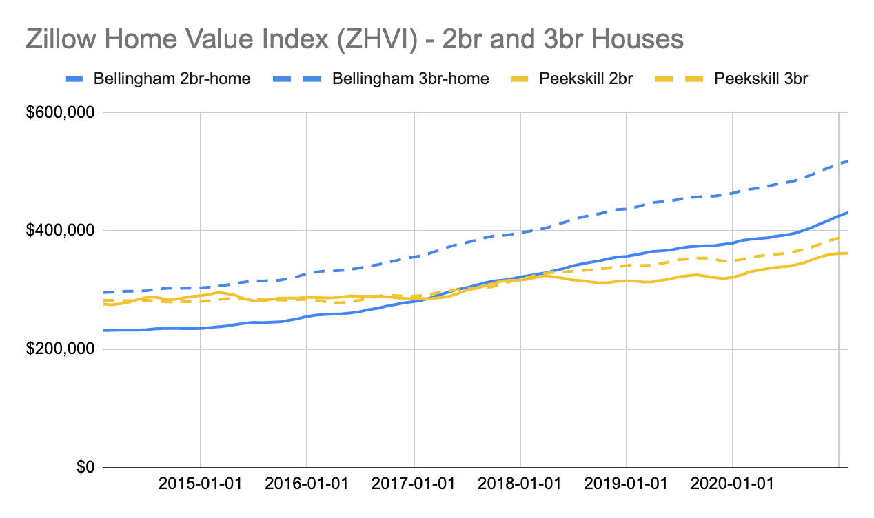 Both Bellingham and Peekskill are quiet, safe, and relatively affordable (though not stunningly affordable—and as with most places, prices are on the rise):