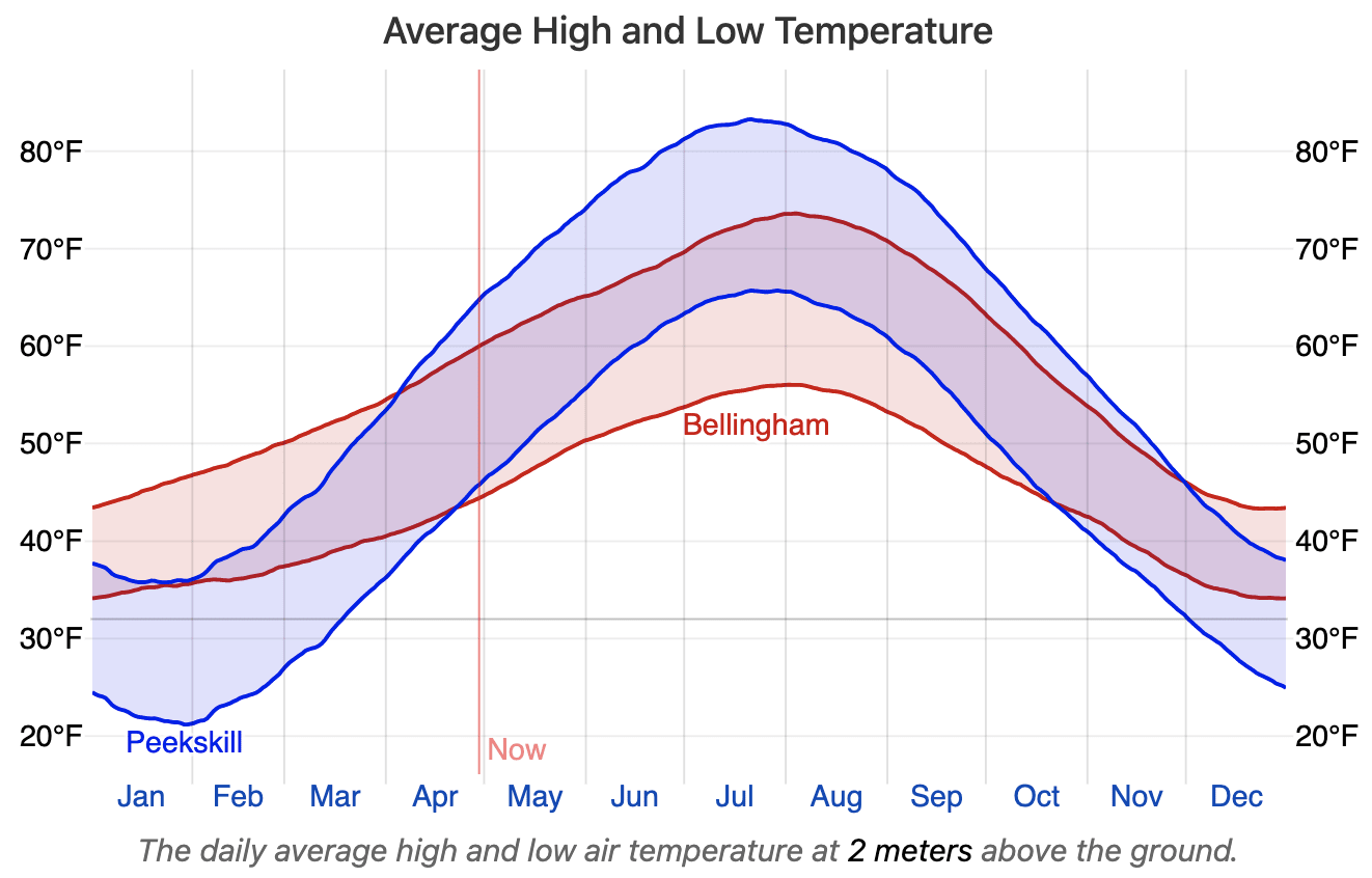 The area has real seasons, with deciduous trees that lose their leaves in the fall. Winter is much colder than in Bellingham, and summer is much hotter. (Bellingham’s weather is something like Berkeley’s with everything shifted 5-10°F colder.)