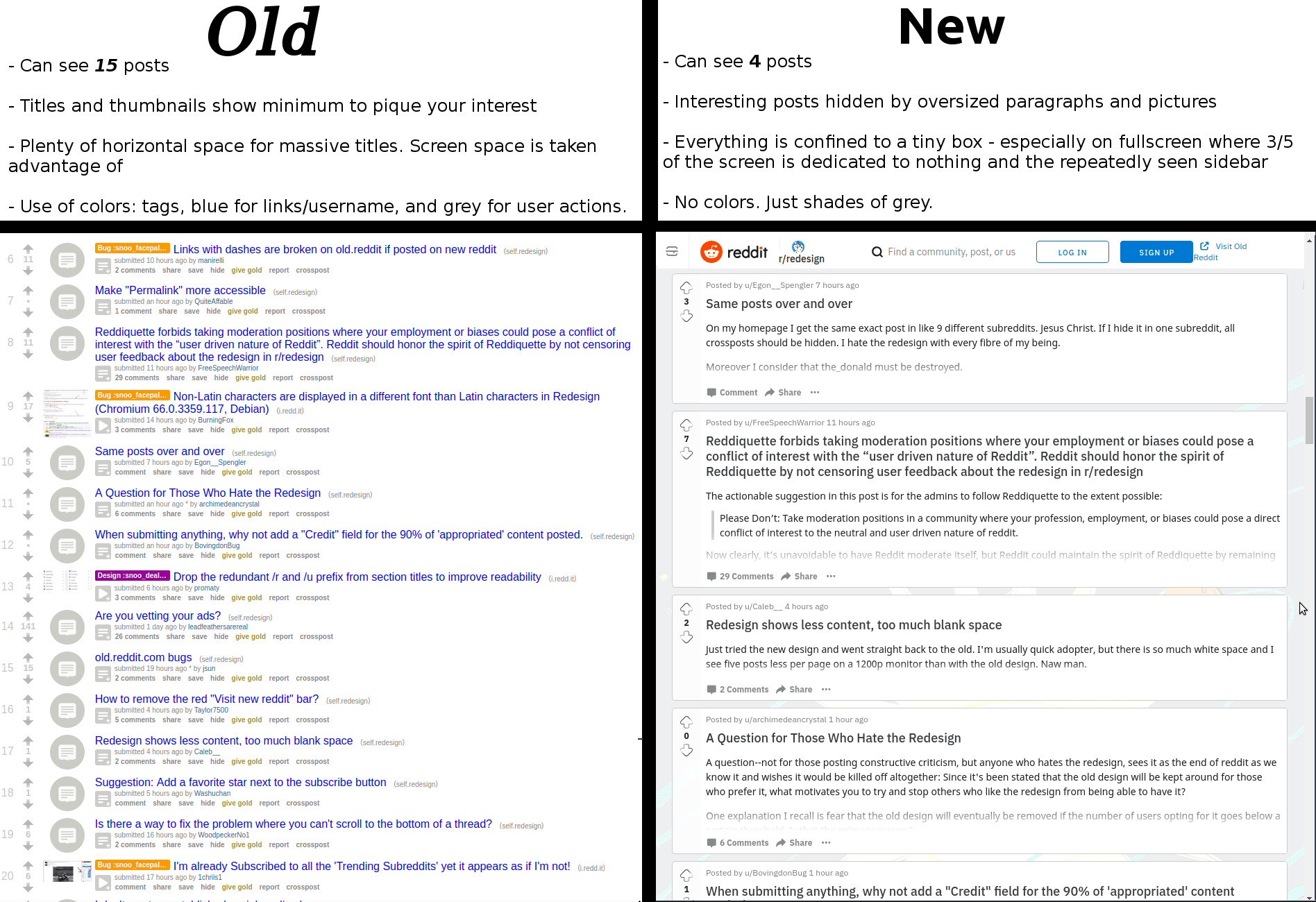 I’m not convinced that the new reddit example is worse than the old one. They serve different purposes, the new one lets you actually read the posts without having to click in. It’s also more pretty and clean - I expect the median and modal user to like the new UI better even if it less useful to reddit powerusers.