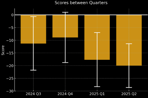 The bot team did not improve significantly in Q2 relative to the human Pro team: The bot team’s head-to-head score against Pros was -11.3 in Q3 2024 (95% CI: [-21.8, -0.7]), then -8.9 in Q4 2024 (95% CI: [-18.8, 1]), then -17.7 in Q1 2025 (95% CI: [-28.3, -7.0]), and now -20.03 [-28.63, -11.41] with no clear trend emerging. (Reminder: a lower head-to-head score indicates worse relative accuracy. A score of 0 corresponds to equal accuracy.)