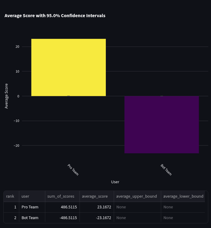 We then calculated the head-to-head scores of the two teams, along with 95% confidence intervals using a t distribution. The average bot team head-to-head score was -20.03 with a 95% confidence interval of [-28.63, -11.41] over 93 questions.