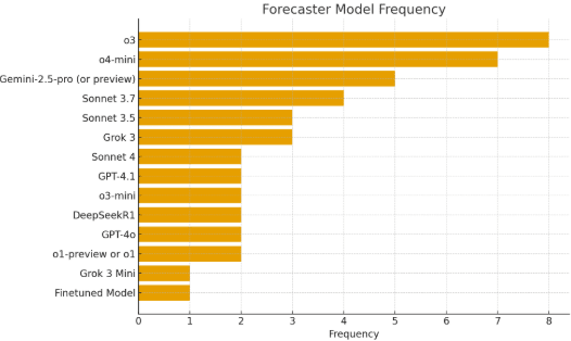 In the survey, we asked “Which LLM model(s) did you use to make your final prediction/answer?”. The results show that o3 was used the most. Nine participants used only a single forecasting model, and three of these used o3 as their only forecasting model. The ten others aggregated forecasts of multiple LLMs, often from multiple providers.