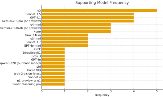 In a similar vein, we asked “Which LLM model(s) did you use in supporting roles (i.e., not final predictions)?”. Again, o3 was used most often.