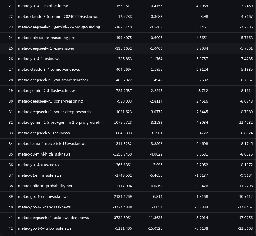 Other small data anomalies: 1) Each metac bot missed some questions on the site due to various factors like provider outages, poorly formatted responses, etc. 2) There was a bug in the multiple choice parsing code that a large percentage of competitors and metac-bots were using. We relaunched the 8 affected questions. 3) For Metac Bots that did not use AskNews and instead used a research-enabled LLM to get their research report (e.g., Perplexity), the full question JSON was passed to the research LLM’s prompt. In previous quarters, only the question text was passed to the prompt.