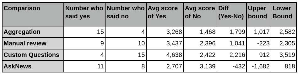We wanted to explore the difference between average coverage-adjusted scores on a couple of points. We chose some questions we were interested in testing the effectiveness of. Among the questions in the survey, we asked participants to check a box if they used code to “Take the median/mean/aggregate of multiple forecasts”, if they did “Significant testing via manual review of bot outputs (more than sanity checks)”, if they did “Testing via custom question creation/resolution”, and if they researched questions with “AskNews”. We then calculated the average score of those who said yes and no, took the difference, and found the upper and lower bounds using a 95% confidence interval. Please note that the sample sizes on these are small, and do not meet the n > 30 check for normality often required for meaningful bounds, so take these results with higher uncertainty.