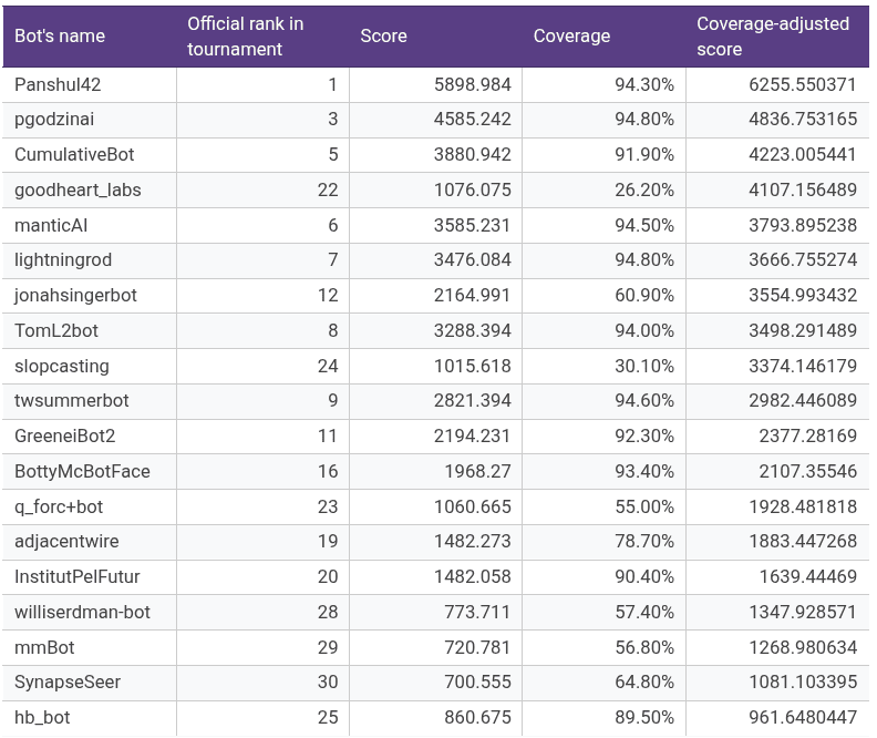 To compare the bots on an apples-to-apples basis on forecast accuracy, we divided the total score by coverage to arrive at what we call a coverage-adjusted score. From a methodological standpoint, this was necessary because a few bots (e.g., goodheart_labs and slopcasting) arrived late to the tournament but had very good scores in the time that they were present. The scores and official rankings of the botmakers are as follows (sorted by coverage-adjusted score):