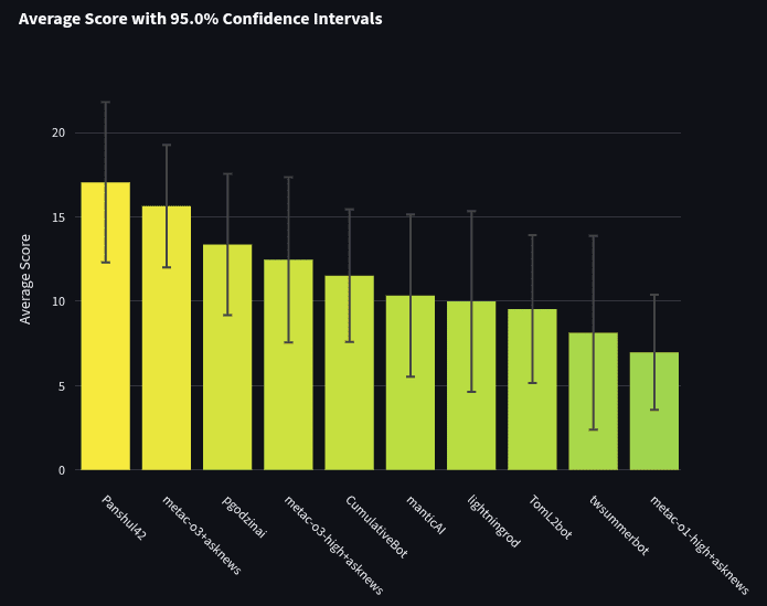 Let's first look at our top bot. Panshul42 performed well. He did much more scaffolding than the Metaculus bots and had a sum of spot peer score of 5,899 in the tournament. He used a combination of o3 and o4-mini for his supporting roles; o3, o4-mini, Sonnet 4 for his final predictions; and a wide combination of sources for his research bots, including AskNews, Perplexity-sonar-reasoning-pro, search engines such as Google/Bing/DuckDuckGo, and static web scraping using HTML. Panshul42 beat the comparable Metaculus bot, metac-o3+asknews, which had a score of 5,131. However, it’s also notable that Panshul42 did not beat metac-o3+asknews within a 95% confidence interval, and the error bars for average spot peer score overlap considerably (see graphs in the previous section comparing top bots). So in this case, scaffolding may have an effect, but not a large enough one to be noticeable.