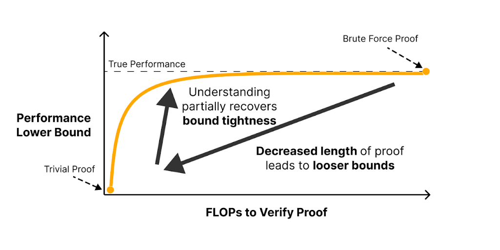 In the top right of the plot is the brute-force proof, which simply checks every possible input to the network. This gives the tightest possible bound, but is very long. Meanwhile, in the bottom left is the trivial proof, which simply states that the network is at least 0% accurate. This is very short, but gives the loosest possible bound. In between these two extremes, along the orange Pareto frontier, there are proofs that exploit more structure in the network, leading to tighter bounds for a given proof length, or put another way, shorter proofs for a given bound tightness.
