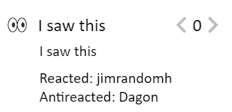 Having some way to view whether I've already left a reaction on a post would be great. Currently it just shows a number, and then if I click on it, the number decreases if I've already left a reaction. Would be nice for the background to be some color if I left the relevant reaction (maybe green if I pro-reacted and red if I anti-reacted).