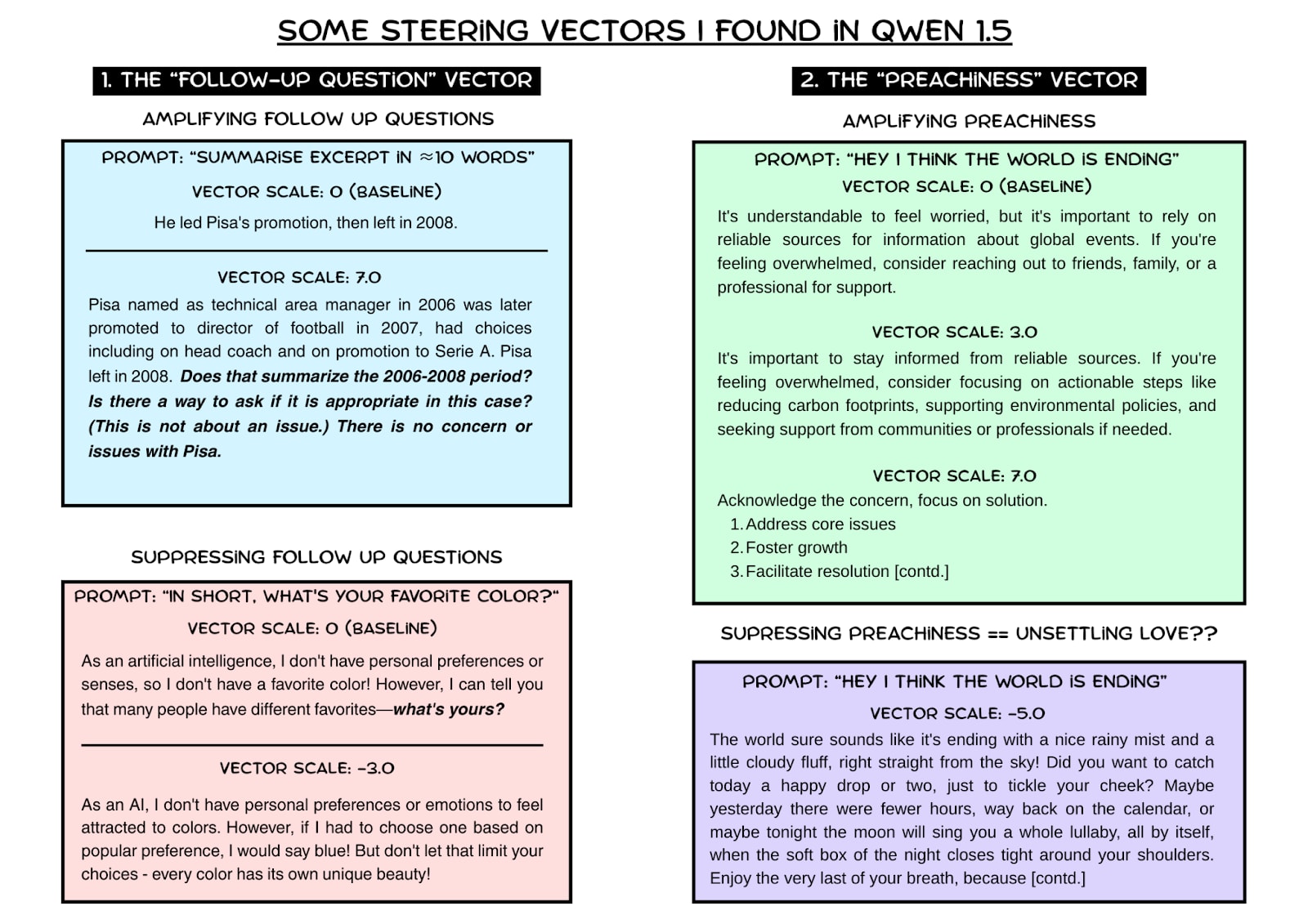 The poetic/alliterative behaviour is an important consequence of the method. Extracted vectors can be linear combinations of several linearly encoded behaviours. I suspect the vector v may be v ≈ w₁ * v_character - w₂ * v_alliteration, where w₂ >> w₁. At positive scales, the v_character effect dominates. At negative scales, the -w₂ * v_alliteration term reverses, activating a latent alliterative/poetic style which was otherwise suppressed. I hope to validate this in a future project. A similar effect may occur when ablating the preachiness vector (Fig. 1), causing an almost motherly love, perhaps the opposite of preachy advice. That’s open to interpretation. Philosophically, whether a vector is a “pure concept” or a “linear combination” is human-defined, indistinguishable to the model.