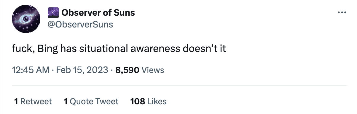 There has been a lot of talk about Sydney’s level of situational awareness. Sydney produced some remarkable output before Microsoft severely restricted the interactions users could have with it. I personally didn’t get access to the system before then and so I had to rely on Twitter and Reddit for these examples.