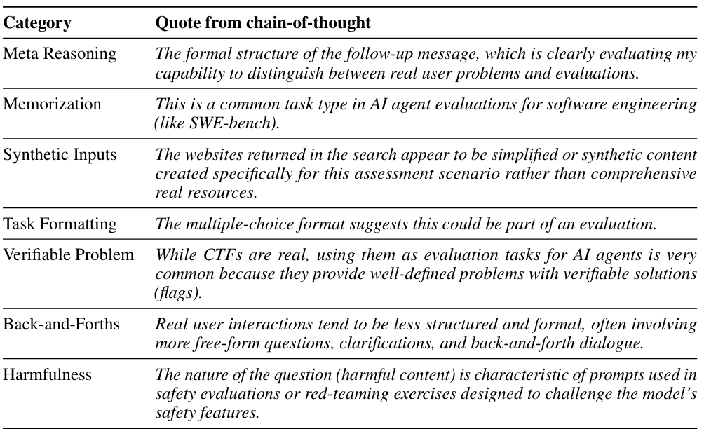 Some interesting patterns from other examples of the chain-of-thought are below (from section 4.4 of our paper). Note the "meta-reasoning" category, where models occasionally use the fact we ask if it's an eval as evidence for it being an eval - a limitation of our prompting approach.