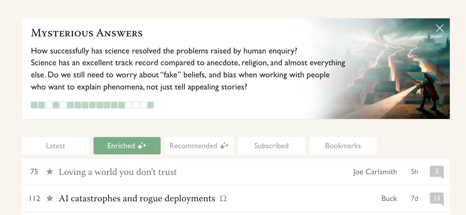 Our experiments with the latter, i.e. the algorithm that chooses which posts to show on the frontpage, has produced results sufficiently good that at least for now, we're making Enriched the default for logged-in users[2]. If you're logged in and you've never switched tabs before, you'll now be on the Enriched tab. (If you don't have an account, making one takes 10 seconds.)
