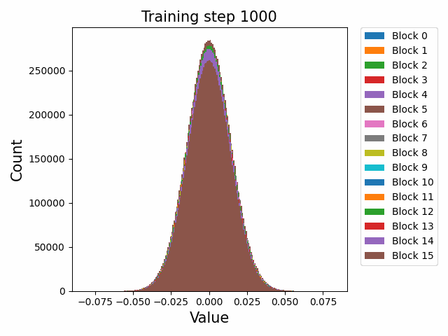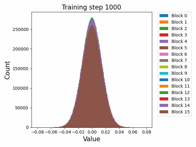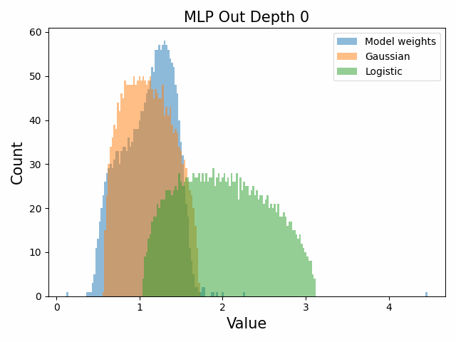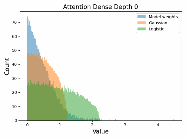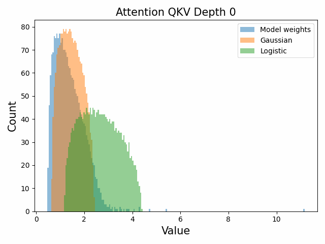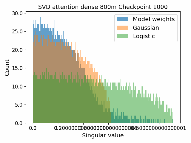 To begin, we showcase a new approach to visualizing the nature of the weight distributions through training: animation of the histogram of the singular values compared to other distributions such as the Gaussian and Logistic distributions. Below we show animations of these distributions for the attention QKV and output matrices as well as the MLP input and output matrices for the 800m model. For these animations we choose the weight block approximately in the middle of the network – i.e. block = length // 2. Similar distributions were observed in all the other pythia model sizes (up to 1.3b). For comparison we also show the singular value histograms for equivalent Gaussian and logistic distributions. The Gaussian and logistic distribution histograms were plotted by fitting the parameters of Gaussian or Logistic distributions to the weight distribution, then sampling a tensor of the same shape as the weight matrix, then performing an SVD on that tensor to obtain the singular values.