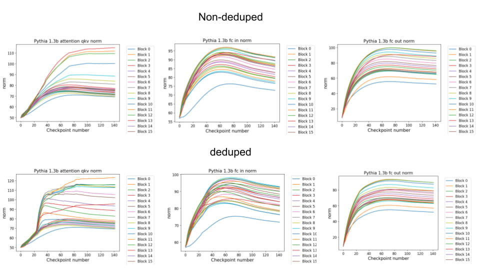 We observe a similar pattern if we do direct comparisons of the weight norms of the 1.3b model for the attention qkv and the MLP in and out matrices for both deduped and non-deduped models. Here again, we observe qualitatively extremely similar patterns between models especially in the MLPs where often even the timing and scale of the evolution of different blocks is extremely similar. We observe slightly more heterogeneity in the attention QKV weights where the deduped model appears to have a much sharper phase shift at checkpoint 20 than the non-deduped model, for reasons that are unclear.