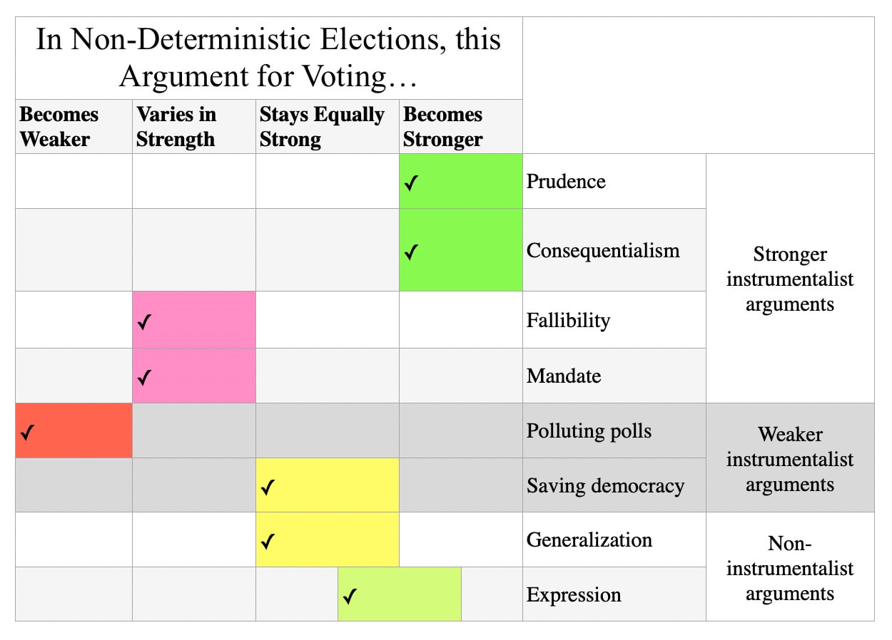 The only argument that weakens our reason to vote in non-deterministic elections is the “polluting the polls argument”, which we looked at and subsequently dismantled in my last post. The rest of the arguments either vary in strength (depending on the circumstances), are equally strong, or are strengthened in non-deterministic elections.