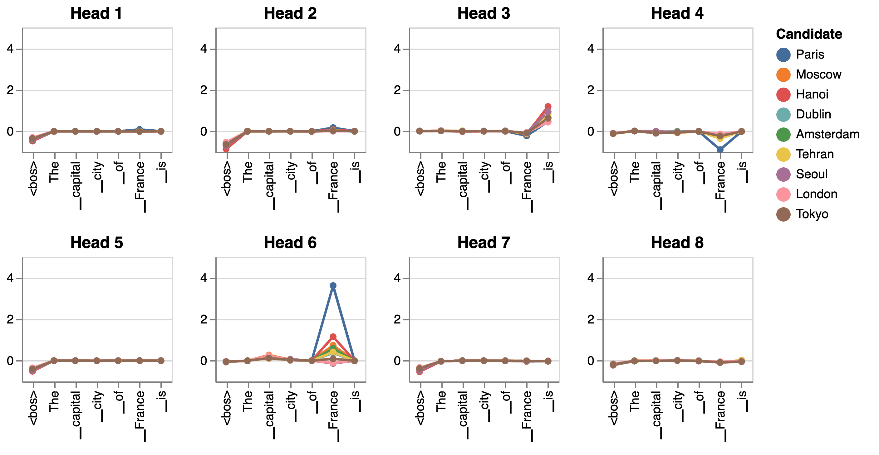 We think 𝑎15 reads the correct output value from somewhere else via the attention mechanism, so we use the attention prism to decompose 𝑎15 into smaller pieces. Figure 4 shows how much each input token influences the output logits via the attention layer 15. The ▁France token heavily affects the output through attention head 6 of the layer, which makes very much sense as ▁France should somehow inform the network to output the correct capital city.