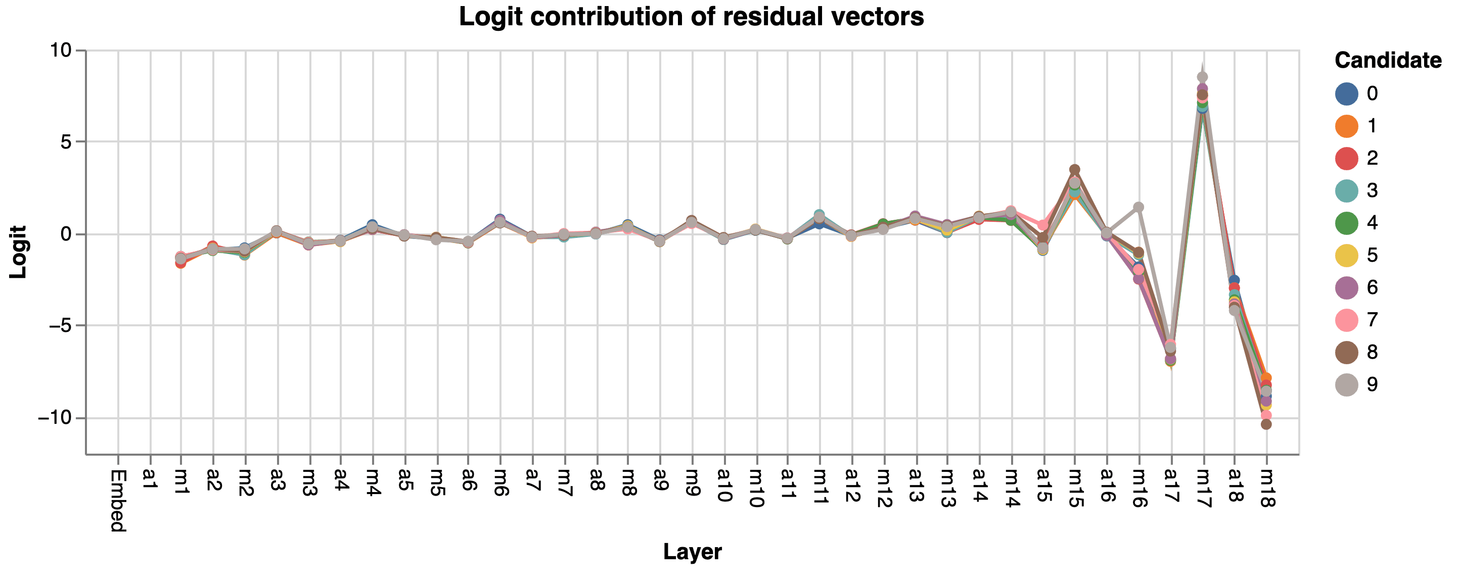 Figure 3 shows each layer’s logit contribution for multiple candidate tokens. Some strong signals stand out, with large positive and negative contributions in the first and last layers. These likely mean these layers play key roles in the model’s predictions. Interestingly, there’s a strong positive contribution at the start, followed by an equally strong negative contribution in the next layer (the first attention output). This might be because the gemma-2b model’s embedding and unembedding vectors are the same. So the input token strongly predicts itself as the output (due to the nature of the dot product operation). The network has to balance this out with a strong negative contribution in the next layer.