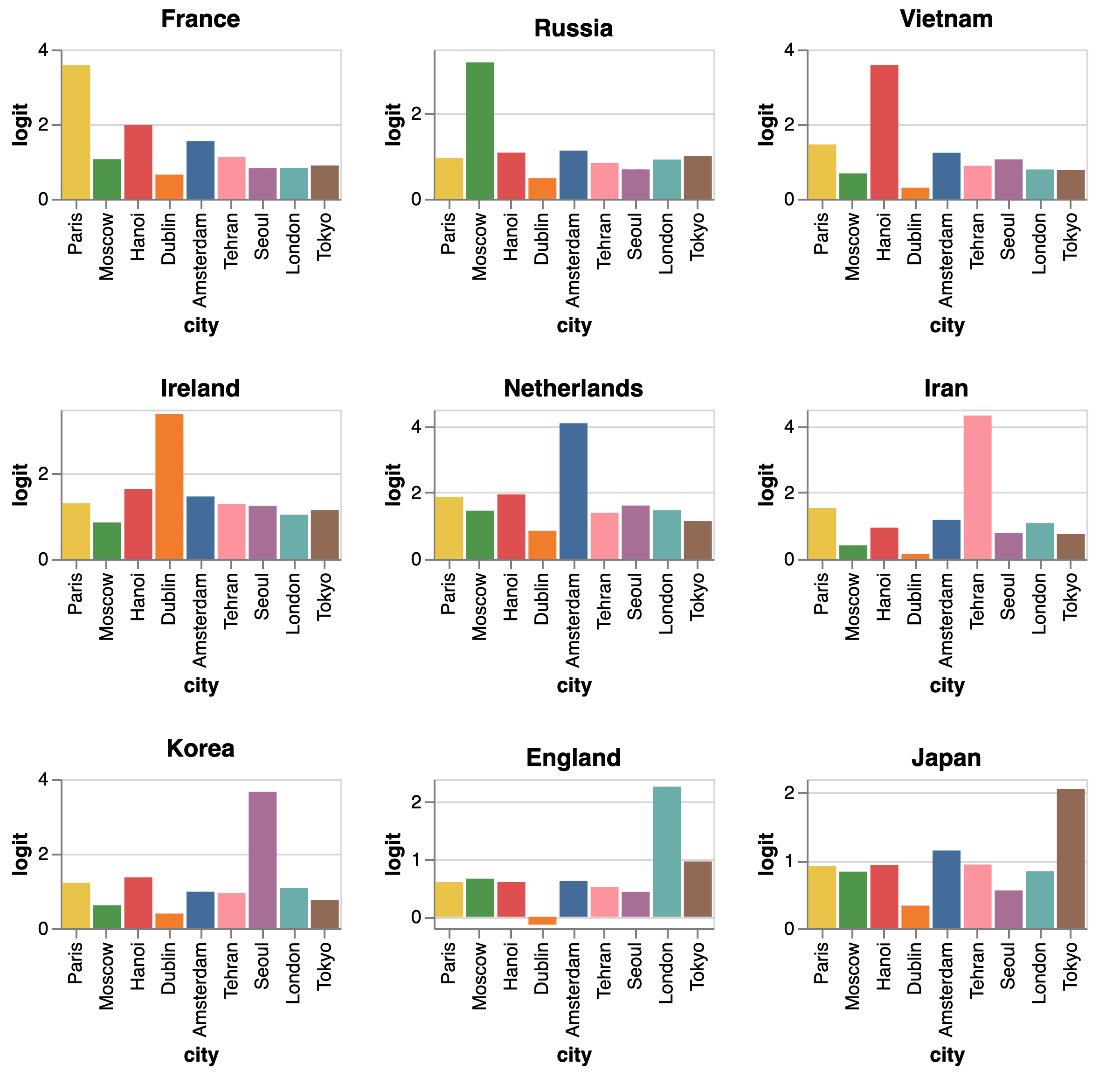 Figure 6: Linear projection from country embedding to capital city’s logit.