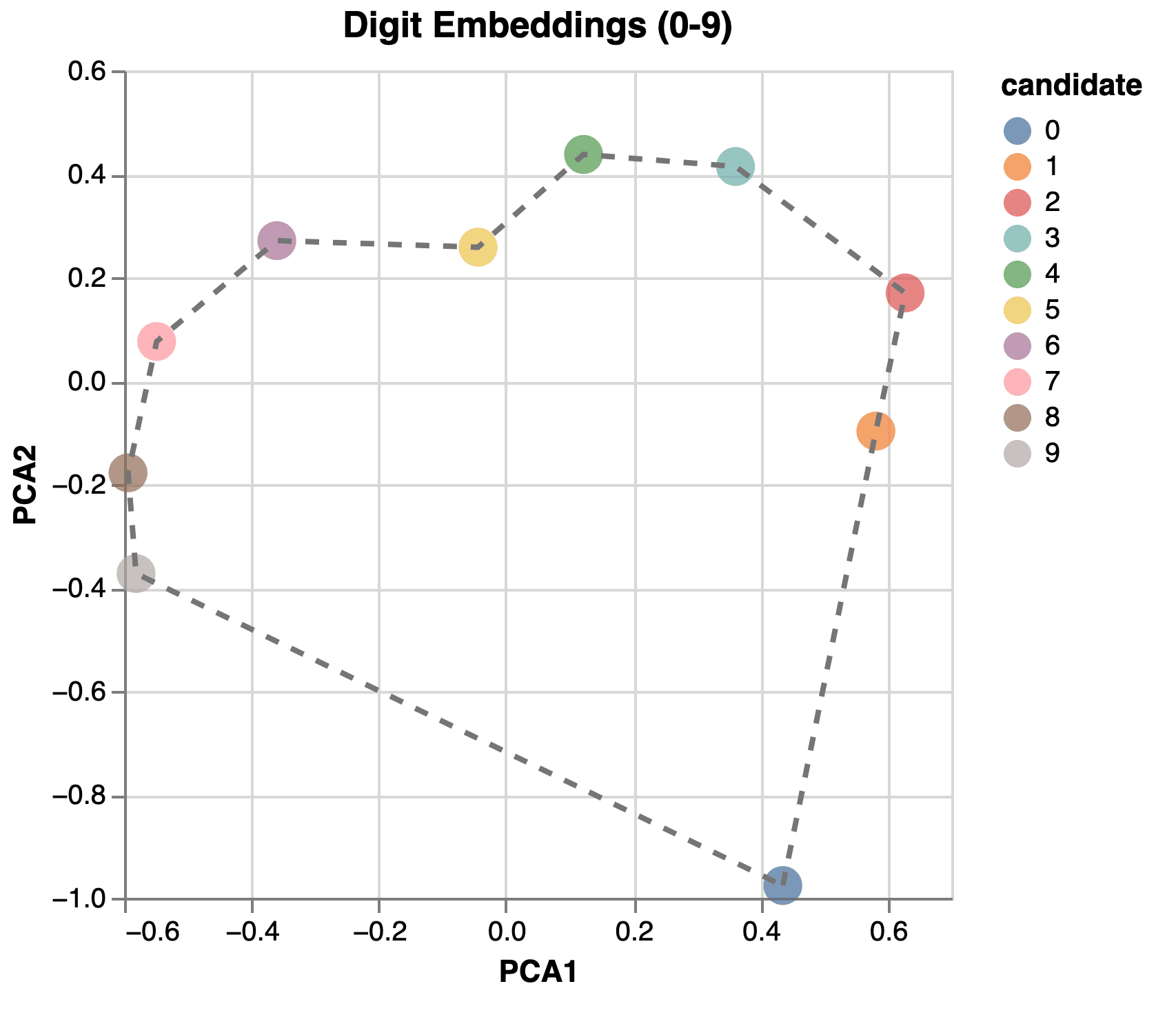 Figure 9: 2D projection of digit unembedding vectors. The embeddings are projected to 2D space using PCA. Each point represents a digit, and the points are connected in numerical order.