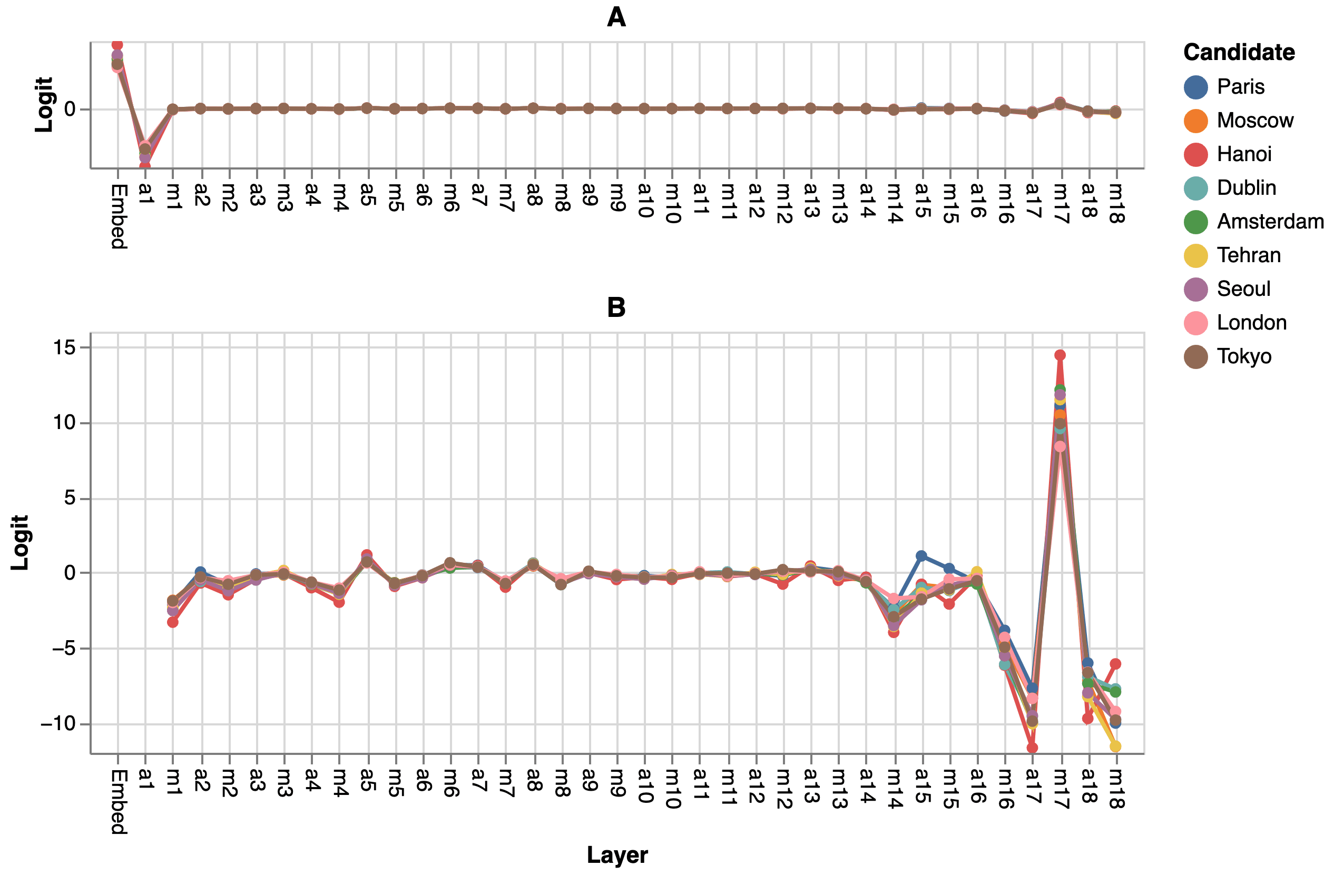 Figure 3 B zooms in to compare logit contributions at each layer for different targets. The 𝑎15 contribution stands out between ▁Paris and other candidates. At this layer, the attention output aligns much more with the unembedding vector of ▁Paris than other candidates.
