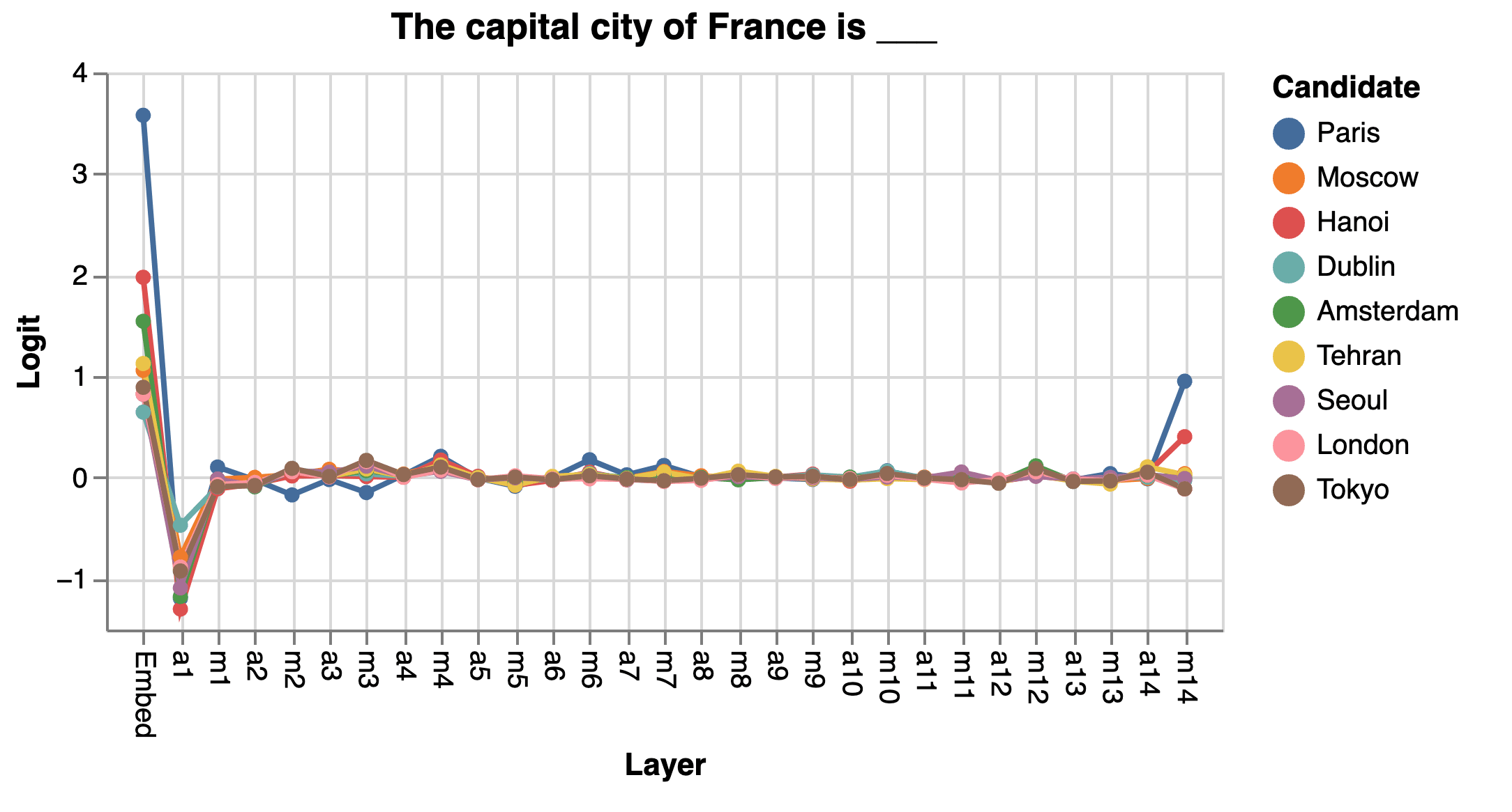 We start by using the residual prism to plot how much each layer contributes to the logit output for several candidate tokens (different capital cities). Comparing the prediction logit of the right answer to reasonable alternatives can reveal important information about the network’s decision process.